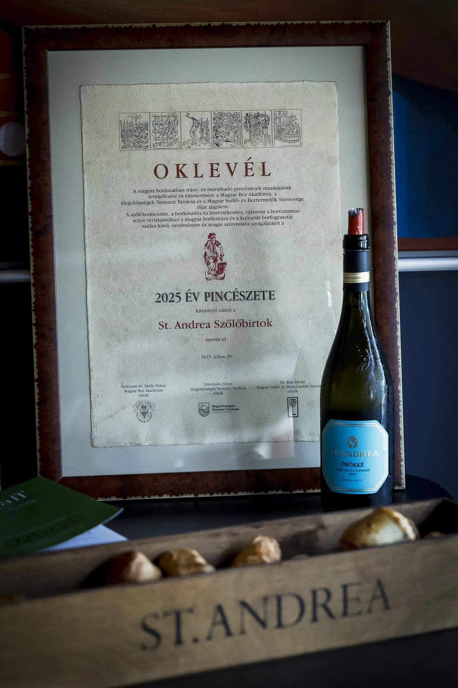 Ahogy a díjátadón elhangzott: "A Hegyközségek Nemzeti Tanácsa, a Magyar Bor Akadémia és a Magyar Szőlő- és Bortermelők Szövetsége által alapított, „Az Év Pincészete Magyarországon” kitüntető címet 2025-ben az egerszalóki St. Andrea Szőlőbirtok kapta. A díjjal a birtokot vezető édesapa és fia, idősebb és ifjabb Lőrincz György újabb biztatást kaptak, hogy a Szőlőbirtok és szeretett borvidékük is jó úton jár."